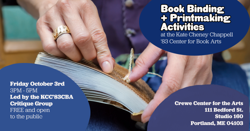 We’re celebrating the new Crewe Center for the Arts on the University of Southern Maine Portland campus, and we’re inviting the public to join us in celebration! As part of the festivities, the Kate Cheney Chappell Center for Book Arts is hosting free book binding + printmaking activities in our brand new Book Arts Studio. Bring friends and family to explore the new space during the building-wide ArtsFest involving music, theatre, dance, book arts and more!
