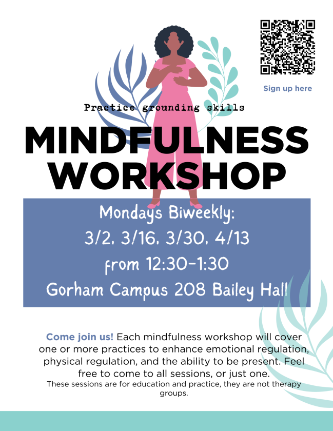 Mondays Biweekly: 3/2, 3/16, 3/30, 4/13 from 12:30-1:30 on the Gorham Campus at 208 Bailey Hall