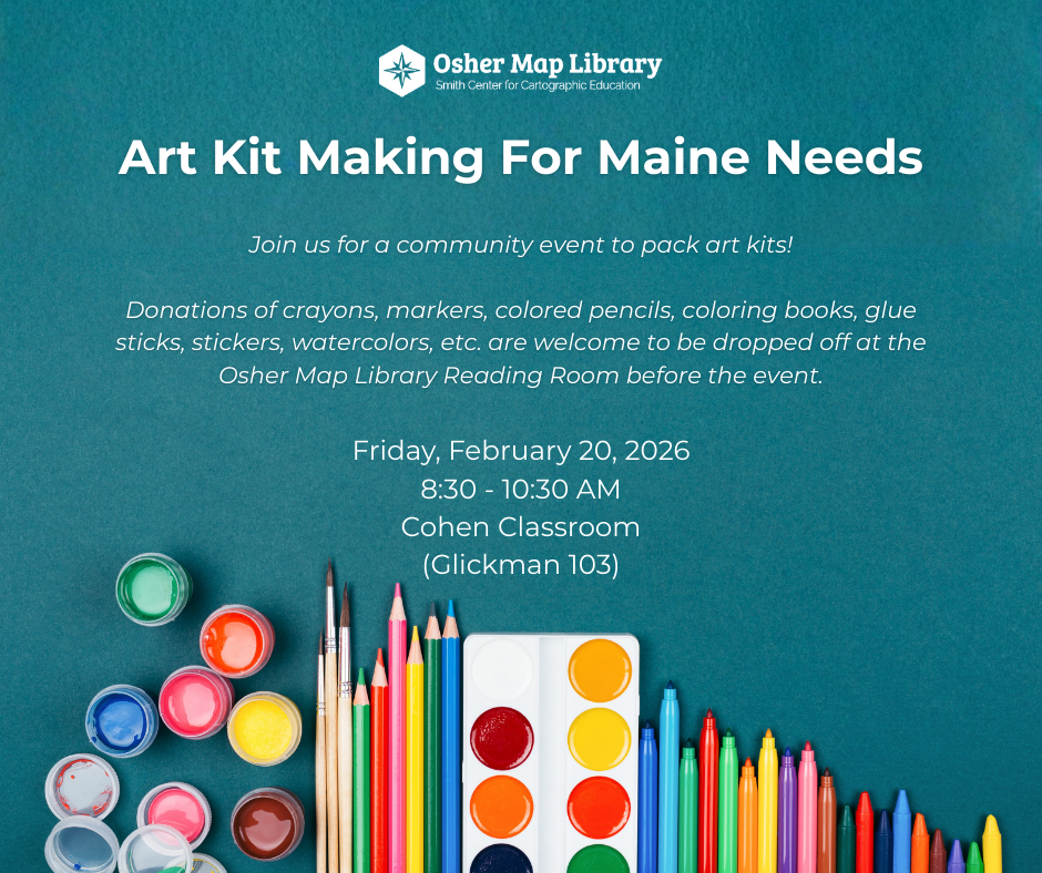 Feb 20 8:30 AM – 10:30 AM Art Kit Making for Maine Needs Osher Map Library — Glickman Family Library 314 Forest Ave, Portland Event Details Get Directions