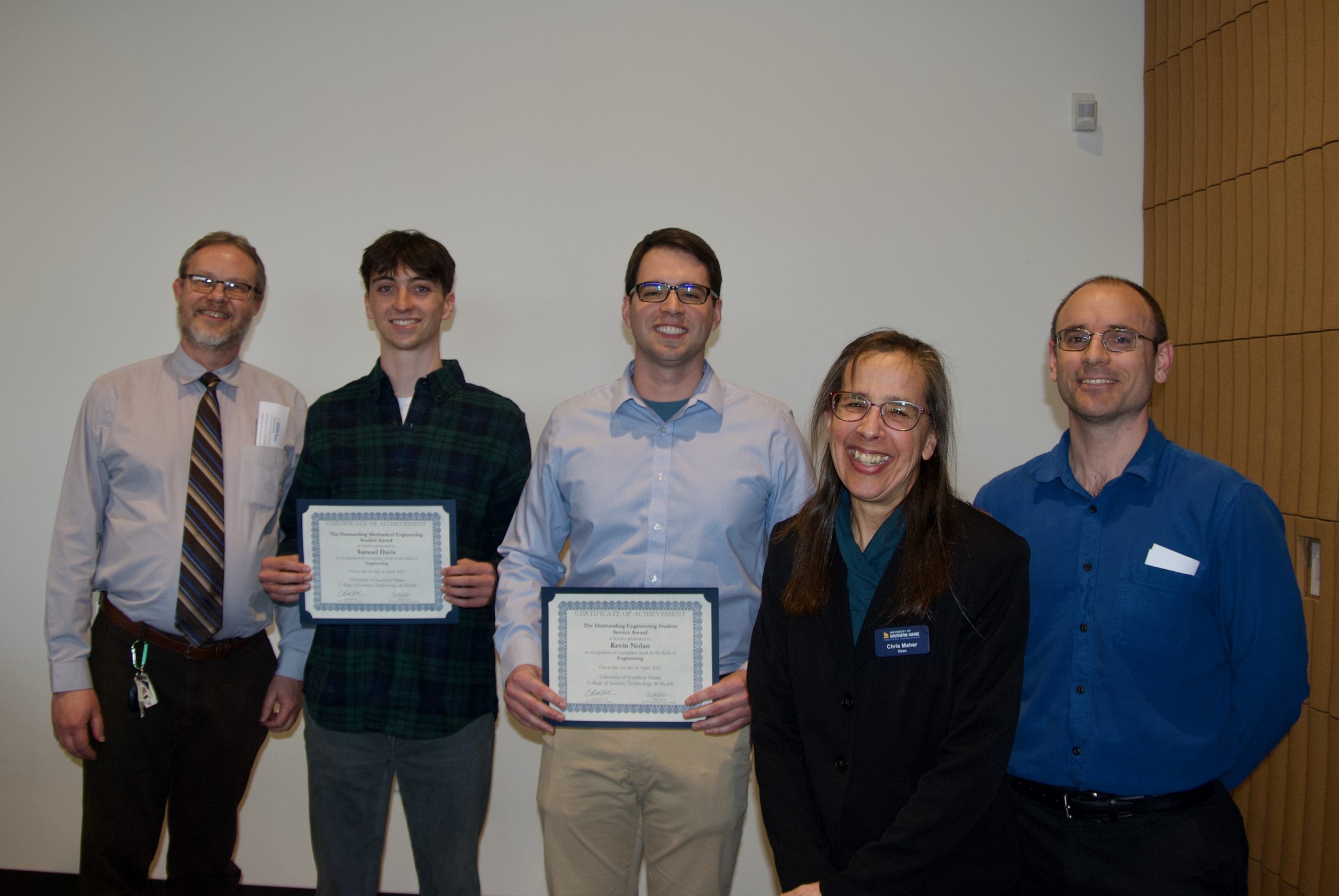 Each year the Department of Engineering honors our top students at the College of Science, Technology and Health awards banquet in April. This year, we recognized three graduating senior engineering students for their academic and service success. Ethan Pike (not pictured) was awarded most outstanding electrical and computer engineering student. Samuel Davis (left) was awarded most outstanding mechanical engineering student, and Kevin Nolan (right) was given the outstanding service award. Congratulations to our students!