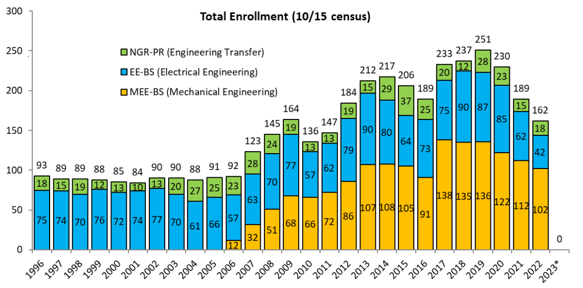 In 2022, we expended our electrical engineering program to include a computer engineering track. Graduates of the program now earn a degree in electrical and computer engineering (ECE). We also introduced Maine’s first Bachelor of Science in Industrial Engineering (BSIE), which was approved for the BOT in the Fall of 2022. This program will seek ABET accreditation in the next available accreditation review cycle with first BSIE graduates expected in 2027. Below are historical data on the total number of enrollments in our programs (top) and the number of degrees grant per program (bottom) as of Q1 2023.