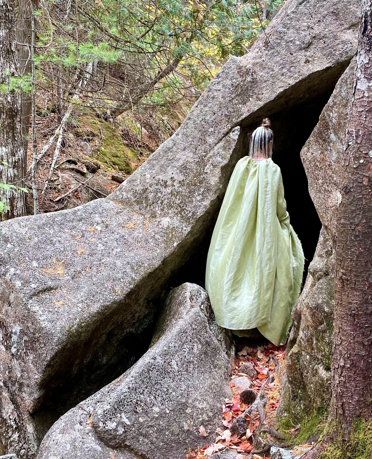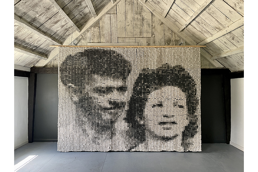 Figure 1. Summer J. Hart, Out in May Back by October, 2023. Hand-beaded tapestry made with abandoned Great Northern Paper Co. newsprint reclaimed from the East Millinocket (ME) Mill, 8 ½ x 12 ft. Image courtesy of Parsonage Gallery.