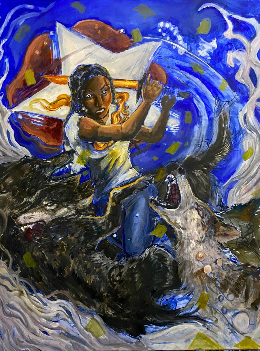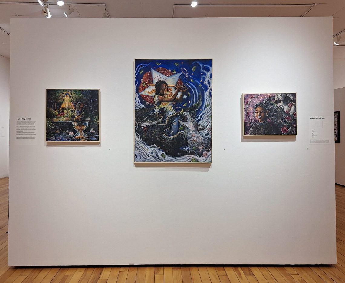 Jayda Ray-James is a painter based in Portland, Maine, working in both digital and traditional mediums. Her artwork offers a vivid, fantastical, and introspective exploration of her identity as a Black woman, using bright, semi-surreal imagery. Primarily figurative, her work focuses on the female form and embraces a maximalist style. Through symbolism and allegory, she tackles themes related to her personal experiences and current events, creating new narratives. Jayda is currently completing her undergraduate studies at the University of Southern Maine, where she is pursuing a Bachelor of Arts degree in Art and Entrepreneurial Studies with a concentration in painting. She has received the EICI Palette of Identity Award from USM and is currently working as a gallery intern at the University Art Gallery.