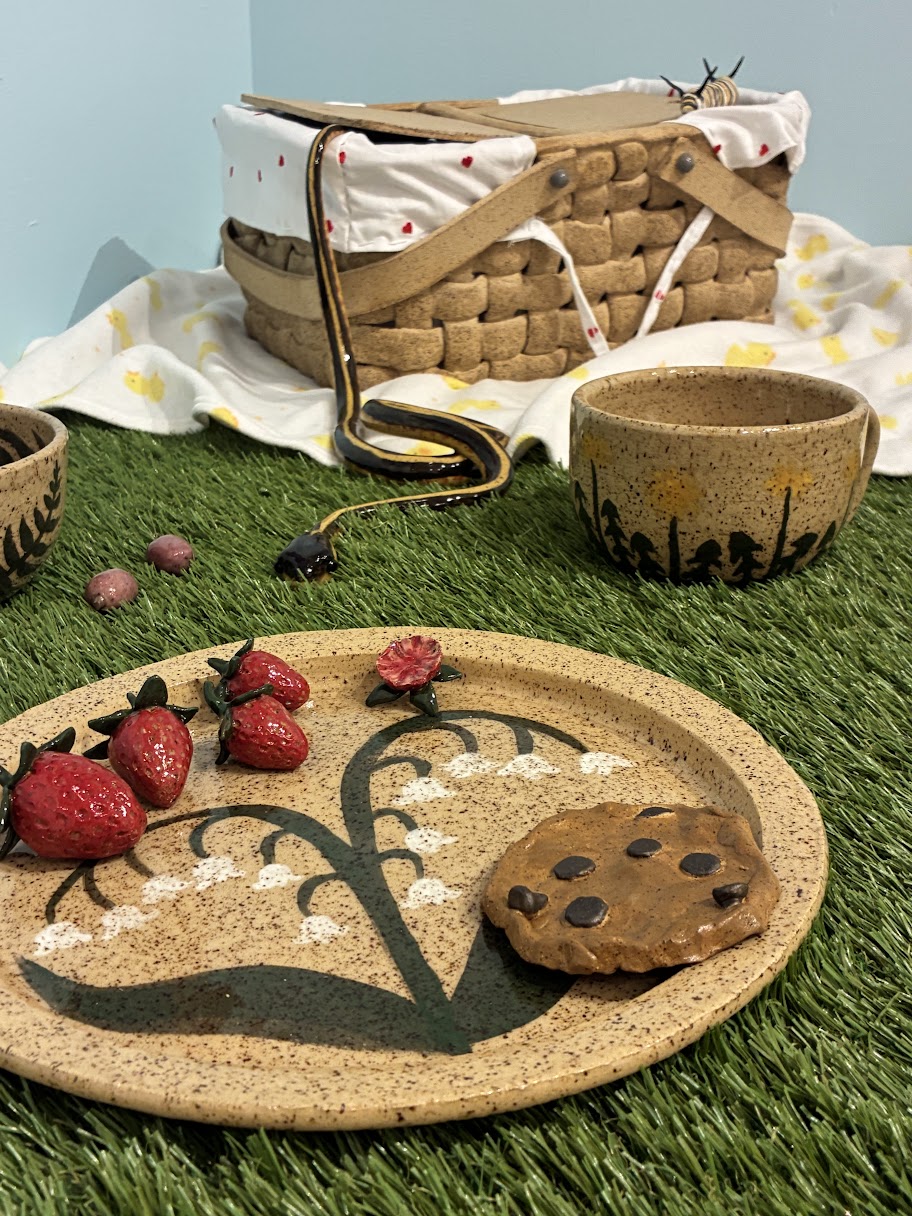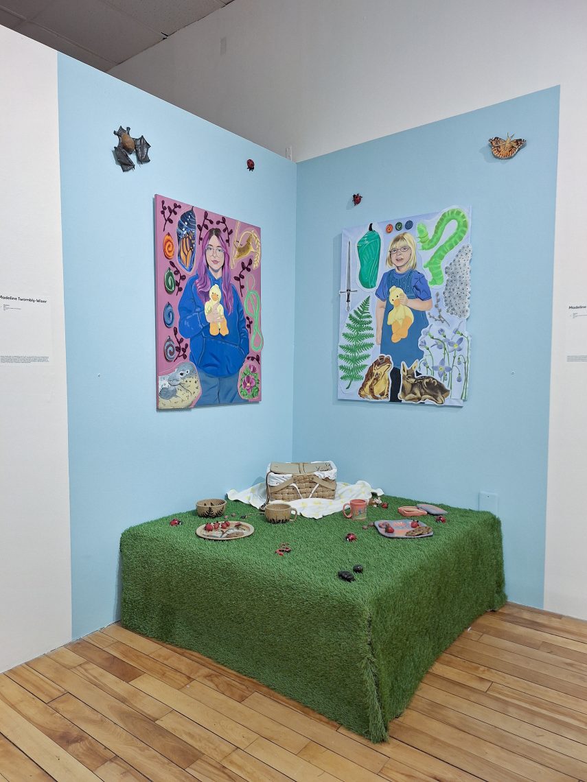 In my show my two selves sit down at a picnic to have this conversation together. My portraits are framed by oil painted and collaged imagery of symbols that represent both specific memories, and the people and things I hold close to my heart. Ceramic bugs and small critters gather with us at the picnic because I’ve always found the natural world both comforting and fascinating. We hang out with our bug friends as we eat together off of our favorite dishes. We are the same but we are different — separated by time and life experience.
