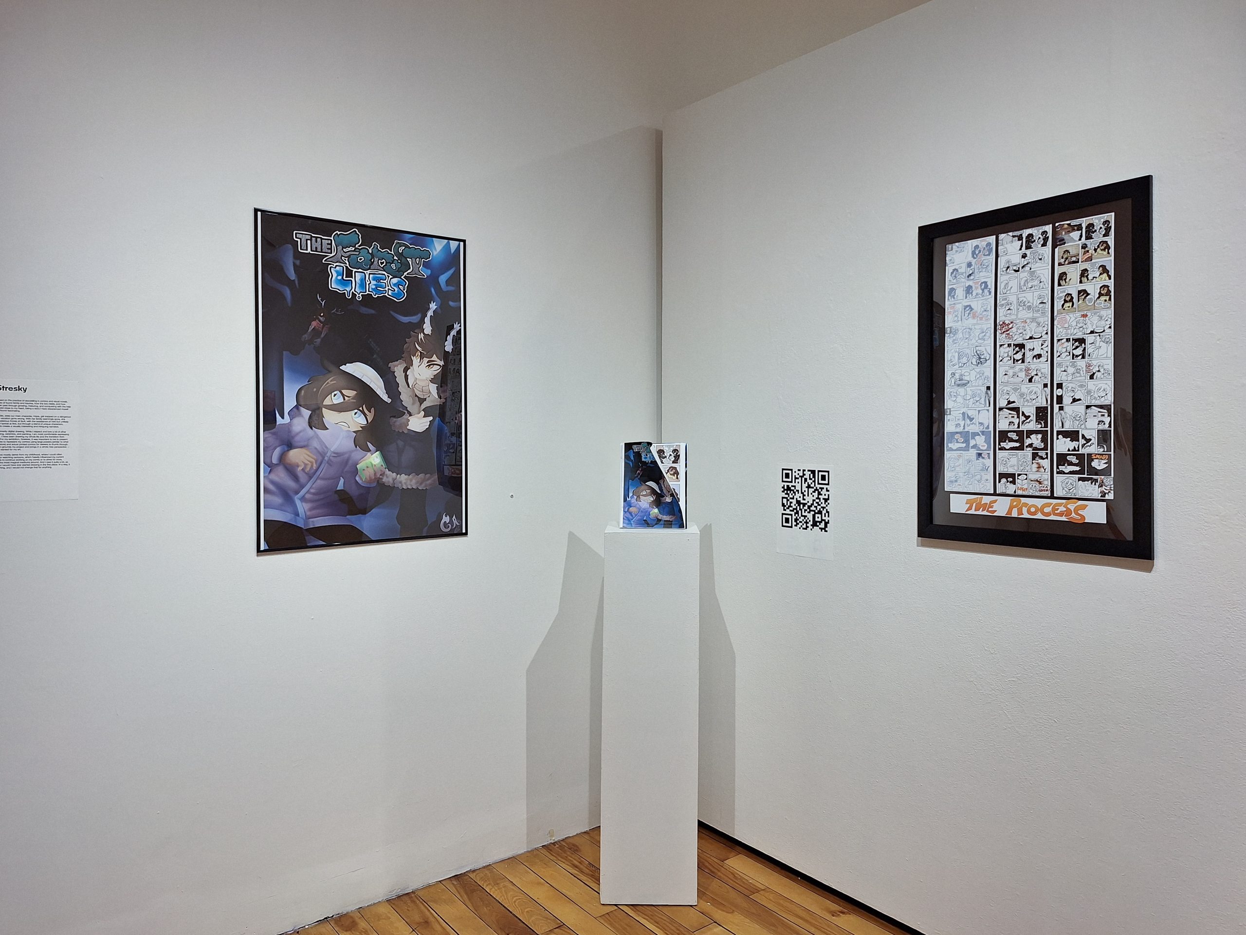 My chosen medium is primarily digital drawing. While I respect and love a lot of other mediums, especially sewing, ceramics, and painting, I am most comfortable expressing myself through digital art. I have been drawing my whole life and the transition from pencil to tablet felt right. For my exhibition, however, it was important to me to present a physical element. I chose to represent my comics using large posters (similar to what you might see at a bookstore) and actual printed comics for viewers to thumb through. This physical presentation grounds my project and brings in a whole new perspective – something I have always wanted for my art.