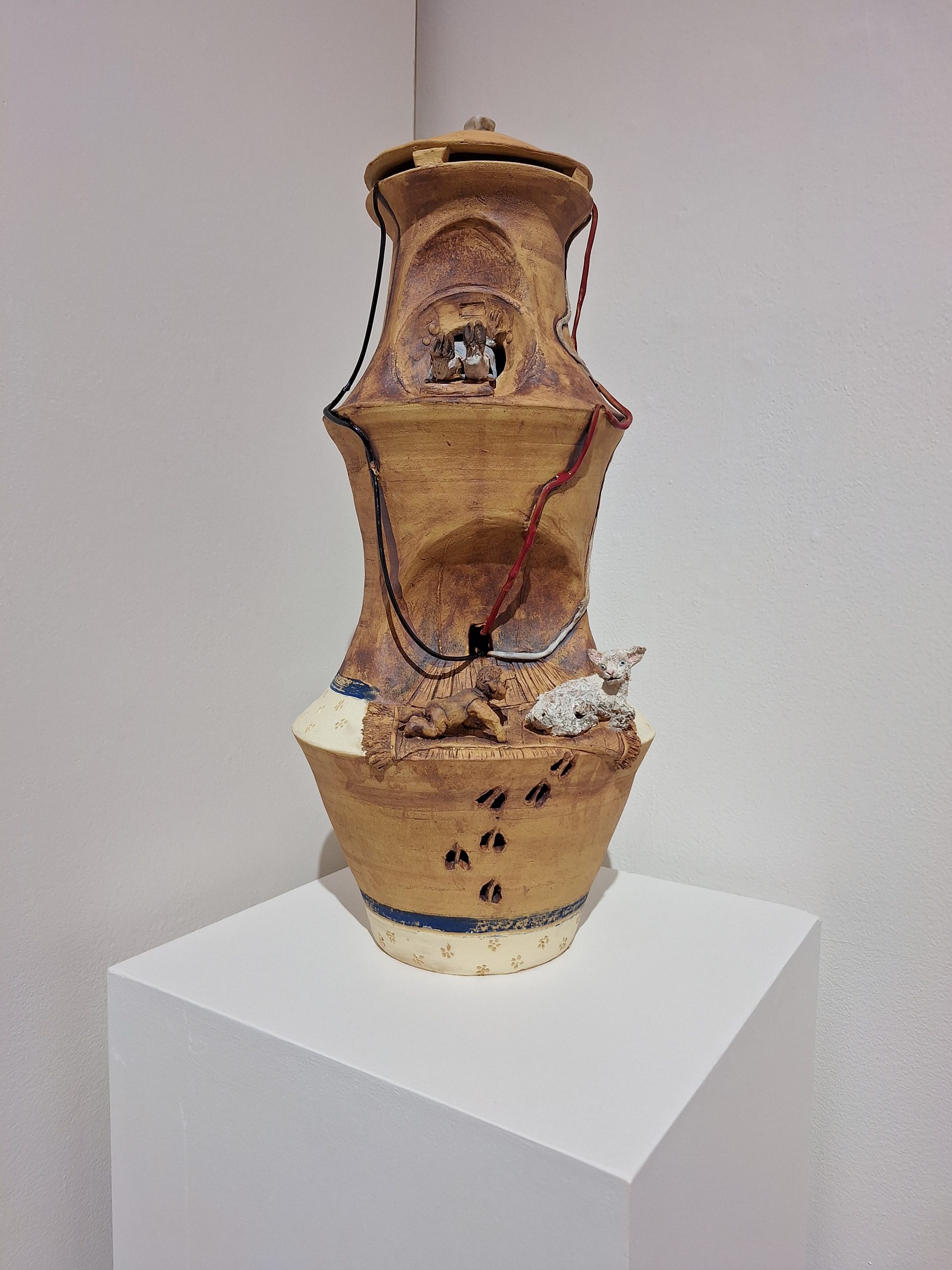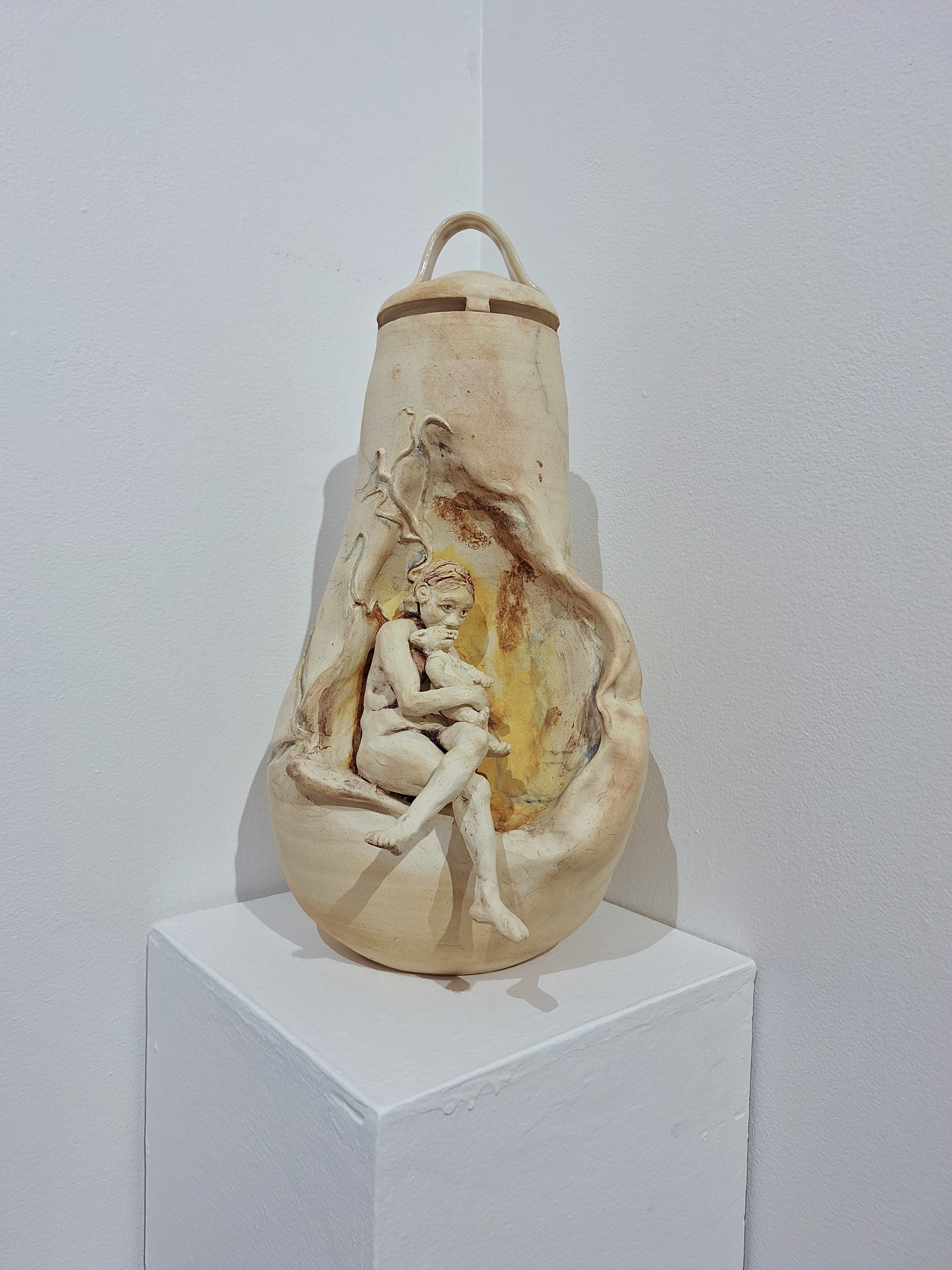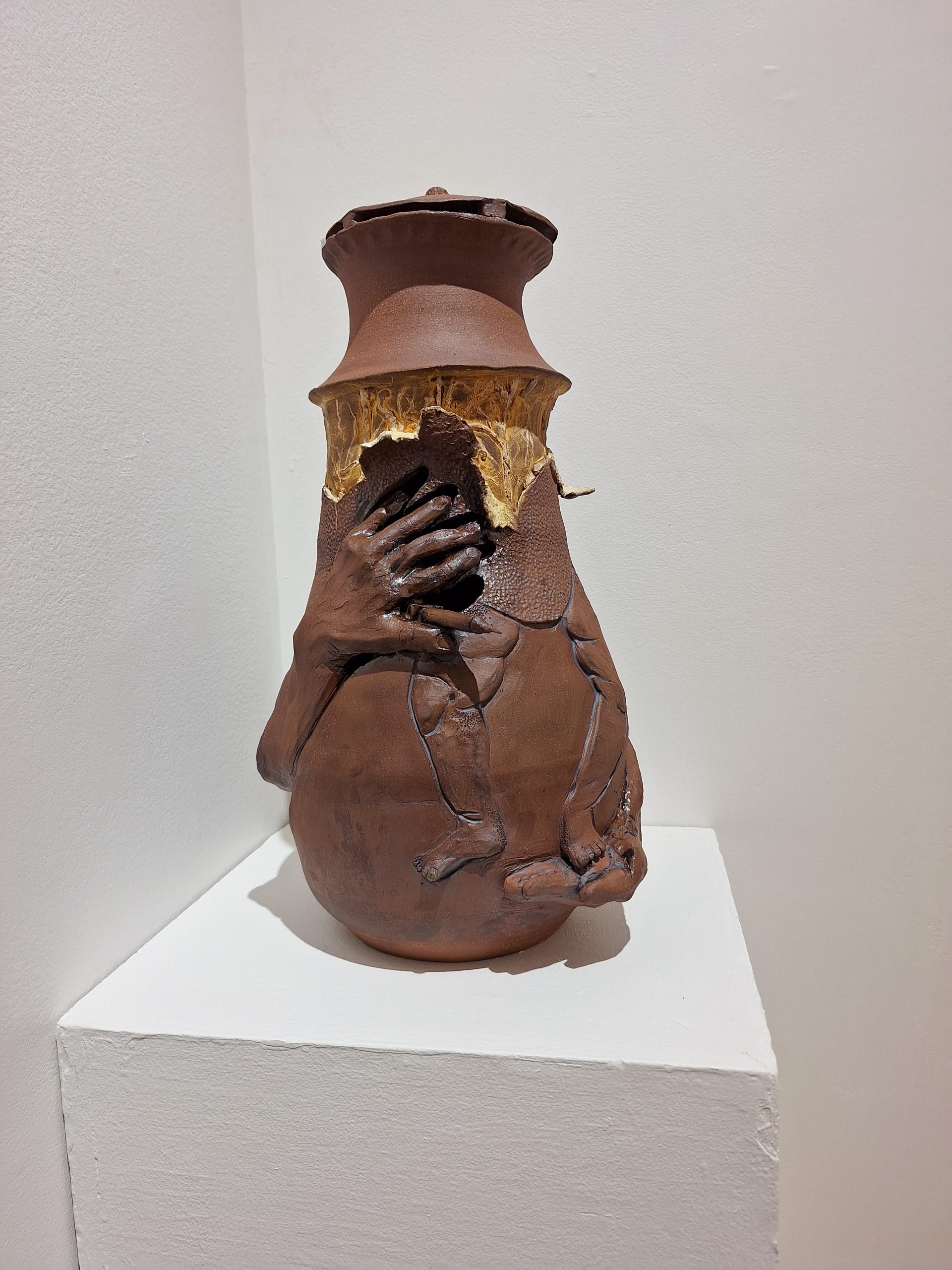 For this exhibition, I created a body of work that expresses my experience of growing up with epilepsy, showing my perspective and my parents’ perspectives. I conducted interviews with them to gather their experiences on parenting a child with epilepsy. My ceramics show the different perspectives, stories, and memories that come from my past. For this body of work, I have created four different pieces that combine to tell a complete story of growing up with a disability. I have used different clay bodies for each vessel; one in a lighter clay, for my mother, a darker clay body for my father, and a brown clay body for me.