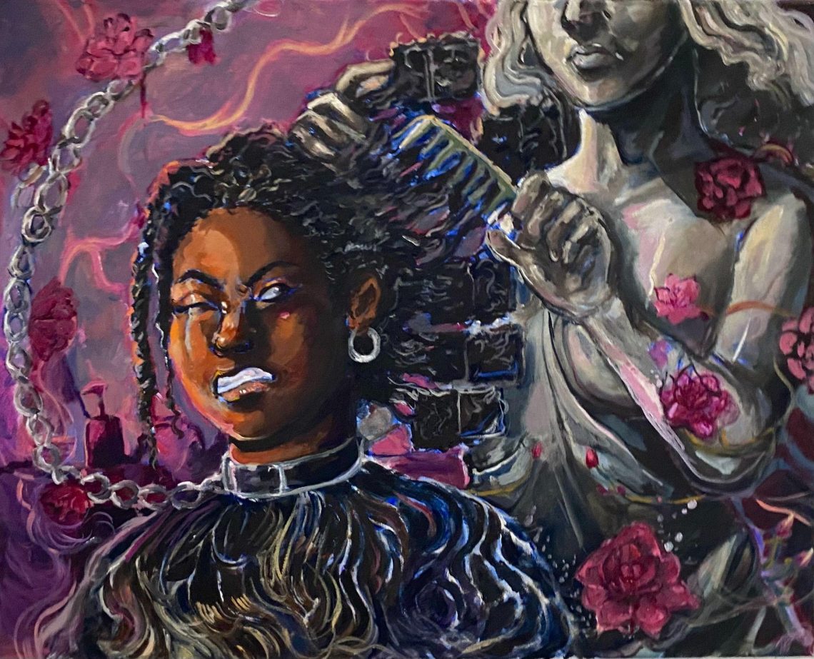 Tenacity is a series of paintings that serves as an introspective exploration of what drives my emotions and reactions to the personal and cultural conflicts Black women face. This work is an extension of myself, reflecting an ongoing dialogue between how I perceive society and how society perceives me as a Black woman. I expose my inner emotions and insecurities through the act of oil painting on canvas, while exploring emotional instability rising from conflicts such as the constant barrage of distressing news to perceptions of beauty and desirability.