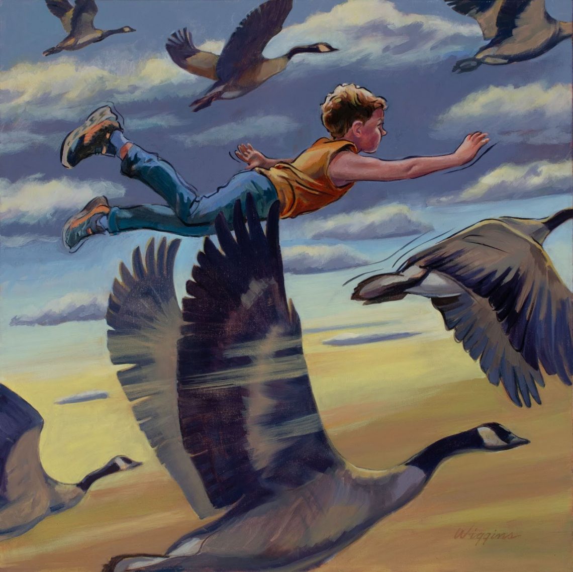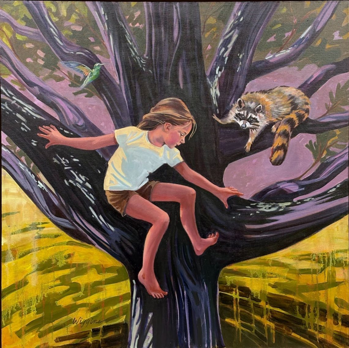 One series delves into moments of joy, as seen in High Five, a piece created for my grandson that celebrates how his imaginative spirit empowers him, with the dynamic gesture symbolizing the boundless possibilities ahead. Another painting, Climbing Tree, captures an intense, immersive focus where action and awareness merge, inspiring my granddaughter to shed all self-consciousness and embrace her true, fearless nature. The act of climbing itself symbolizes overcoming challenges. The third piece, Absorbed, portrays the quieter, more introspective nature of another grandson, whose ability to allow a peaceful moment on a rock to usher in a dreamlike state, where he experiences the profound beauty of the natural world.