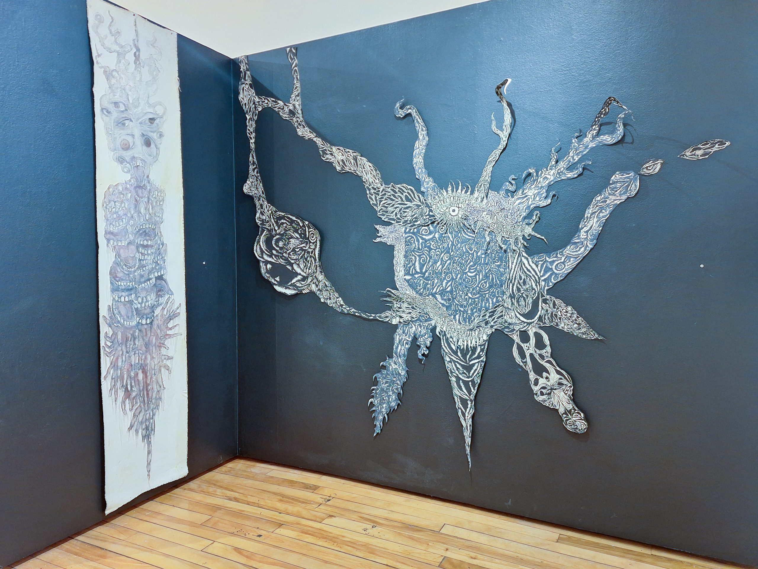 Letting chance play a part in my work has allowed my visual language to develop on its own. Because of this, a large portion of SOUP was unplanned and left up to chance, allowing the exhibition to birth itself and hatch out of my imagination. Viewers are encouraged to immerse themselves in the world of SOUP, and to feel whatever emotions come to them first, whether that be disgust, a morbid fascination, or a deeper understanding. In my future work, I want to continue to explore the state of being amorphous and escaping the traditional, rectangular confines of a frame.