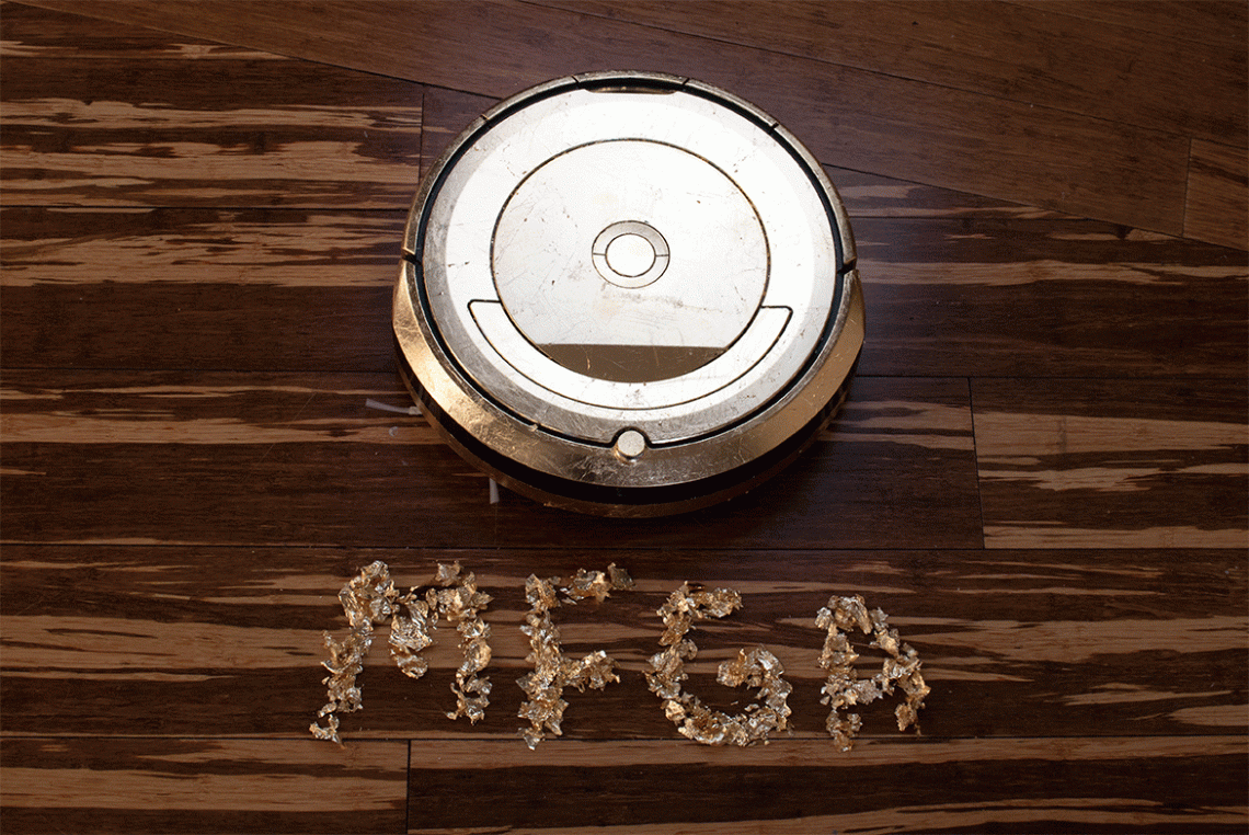 Janna Ahrndt, Make Floors Great Again, 2020–25. Roomba and gold leaf, dimensions variable.