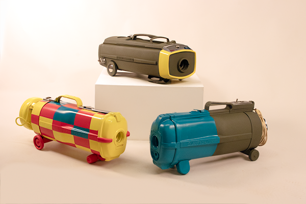 Janna Ahrndt, Captivate & Engage, 2025. Raspberry Pis and mini-LED screens inside vintage vacuums; installation dimensions variable.