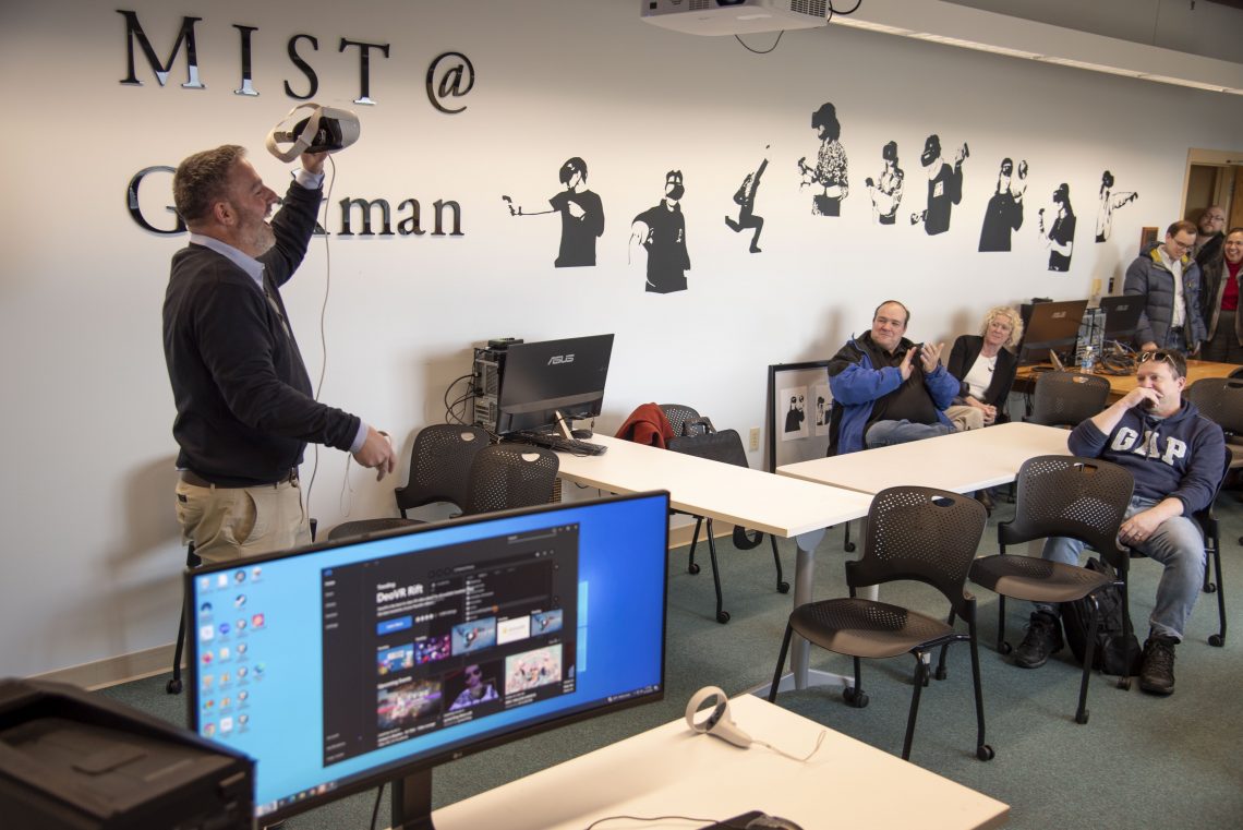 University of Southern Maine’s Provost, Adam Tuchinsky, encouraging others to try the VR headset at VR Lab showcase.