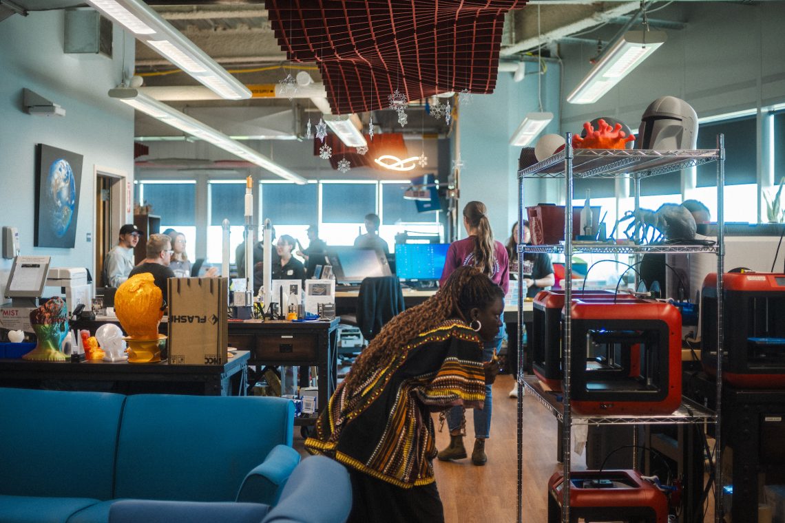 The MIST 3D Printing & Prototyping Lab focuses on prototype development with over twenty 3D printers ranging from beginner capabilities to advanced material. Additional resources include a Glowforge Laser Printer, CNC Mills, Soldering stations, Digital Embroidery, Adobe Creative Cloud, and CAD software.