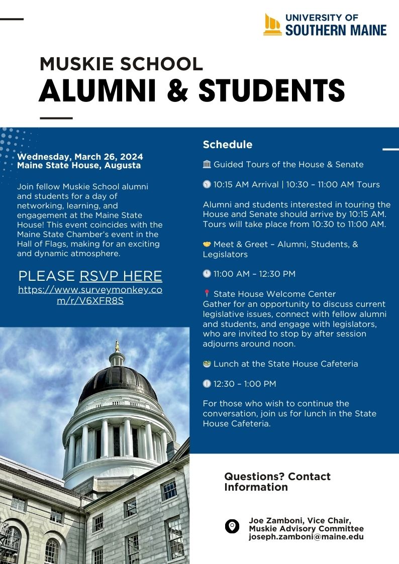 Join fellow Muskie School alumni and students for a day of networking, learning, and engagement at the Maine State House! This event coincides with the Maine State Chamber’s event in the Hall of Flags, making for an exciting and dynamic atmosphere.